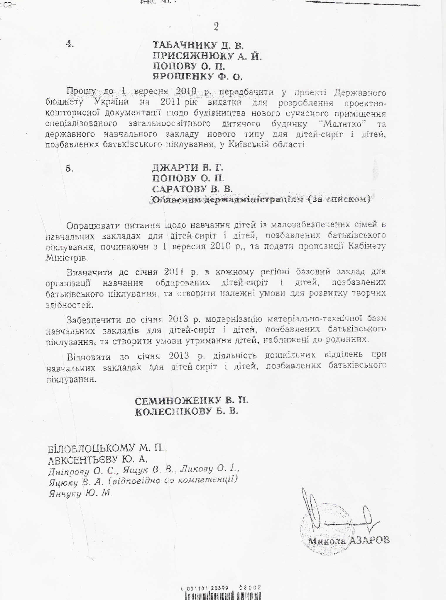 23 червня Прем'єр-міністр України Микола Азаров дав доручення міністерствам і обласним адміністраціям направляти дітей із малозабезпечених сімей на навчання в заклади для сиріт, відкрити при них дошкільні відділення, та створити перший заклад нового типу для сиріт в Київській області.
