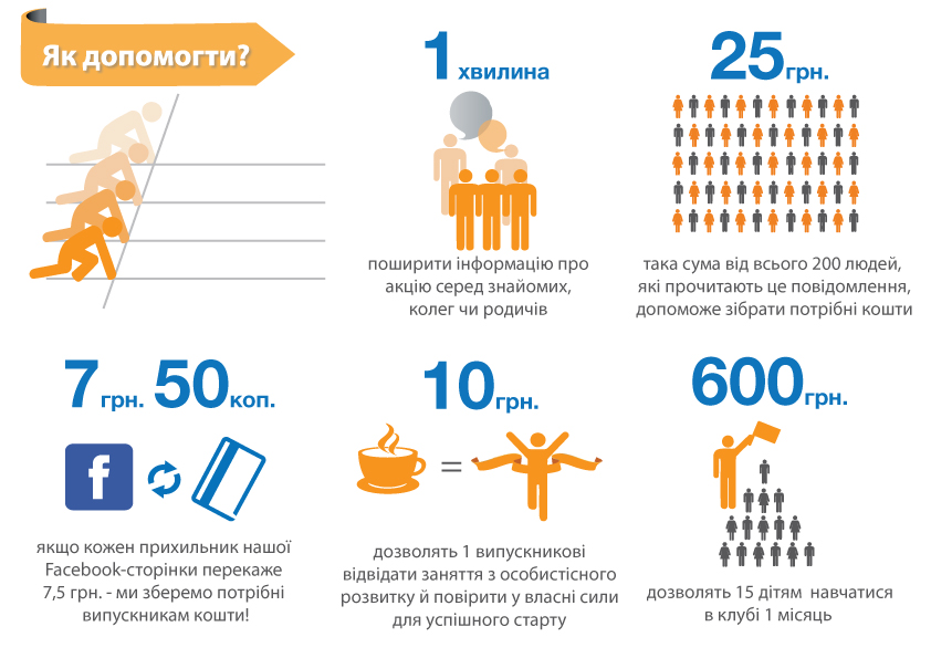 Подальша доля випускників інтернатів залежить від упевненого старту. Їхній успіх може розпочатися тут, разом із Вами, адже одна маленька, але така корисна справа – під силу кожному з нас.