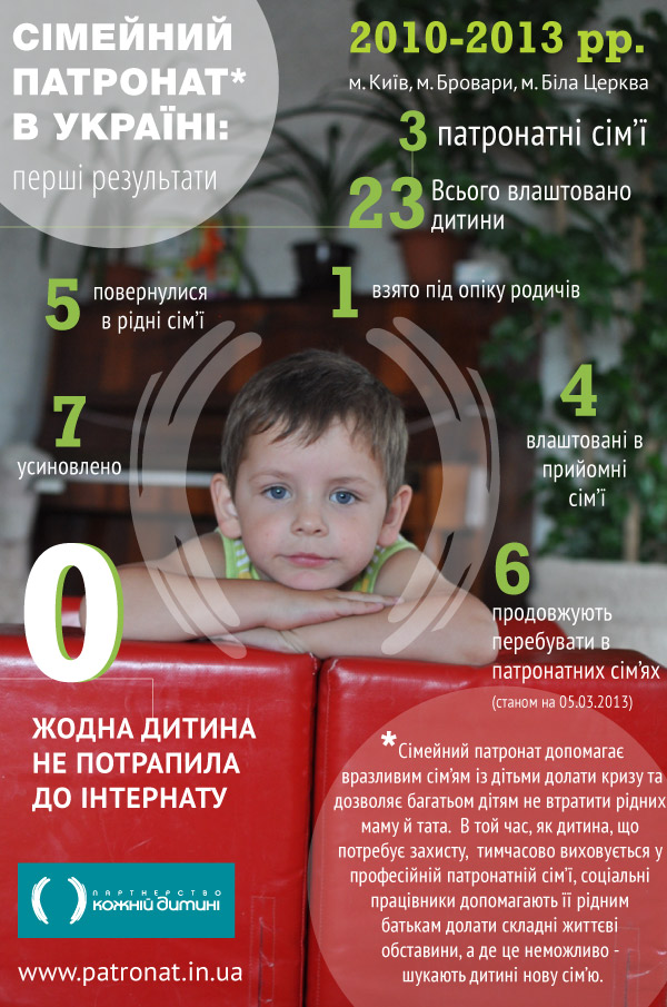 Розпочатий Партнерством у 2009 році в м. Бровари Київської області експеримент із запровадження нової форми соціальної роботи – сімейного патронату, в 2012 році було офіційно підтримано київською міською владою (розпорядження Голови КМДА від 06 листопада 2012 року). Нині проект "Запровадження кращих практик альтернативного догляду дітей, які тимчасово залишилися без батьківського піклування" здійснюється у двох районах міста Києва, а також у мм. Бровари та Біла Церква Київської області. За цей час він вже має перші результати: із 23 влаштованих дітей - жодна дитина не потрапила до інтернату.