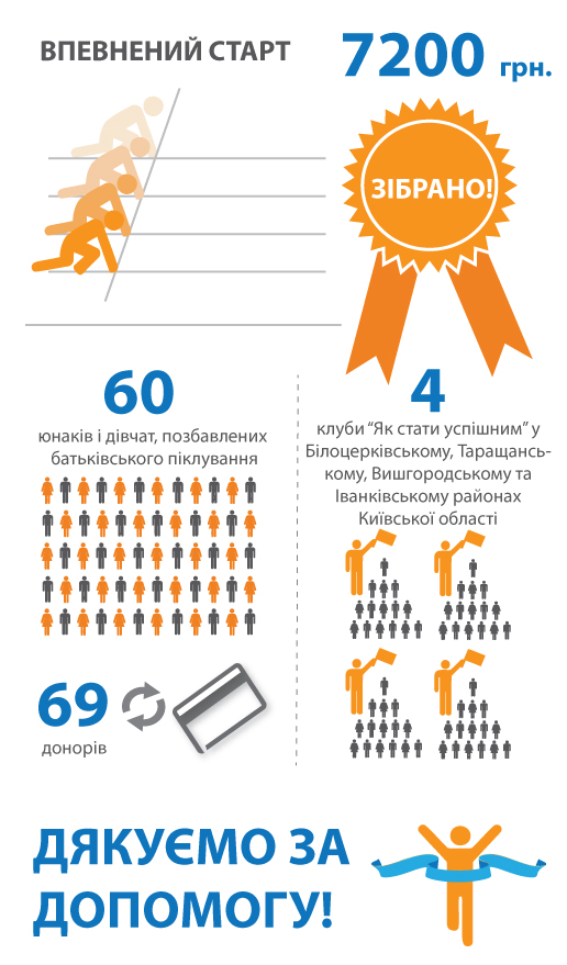 Збір коштів став можливий з допомогою Української Біржі Благодійності – національної фандрейзингової онлайн-платформи. 69 донорів і сотні прихильників долучилися до нашої ініціативи – розповсюджували повідомлення про кампанію, робили репости, «лайкали» нашу сторінку, пересилали інформацію знайомим і друзям. Тільки завдяки Вашій активності, небайдужості, чуйності і розумінню гроші для навчання 60 дітей, які випускаються з інтернатів, було зібрано.