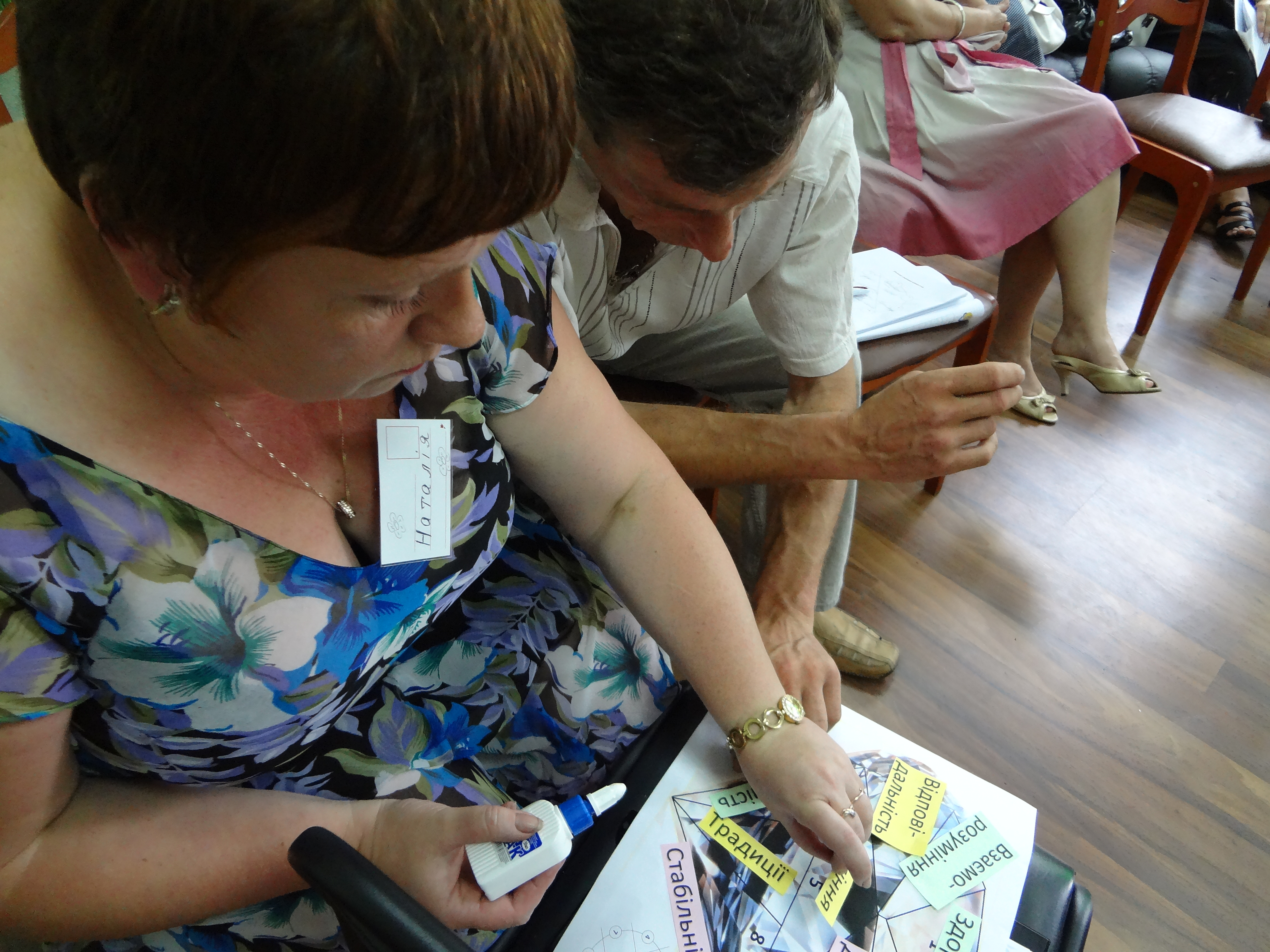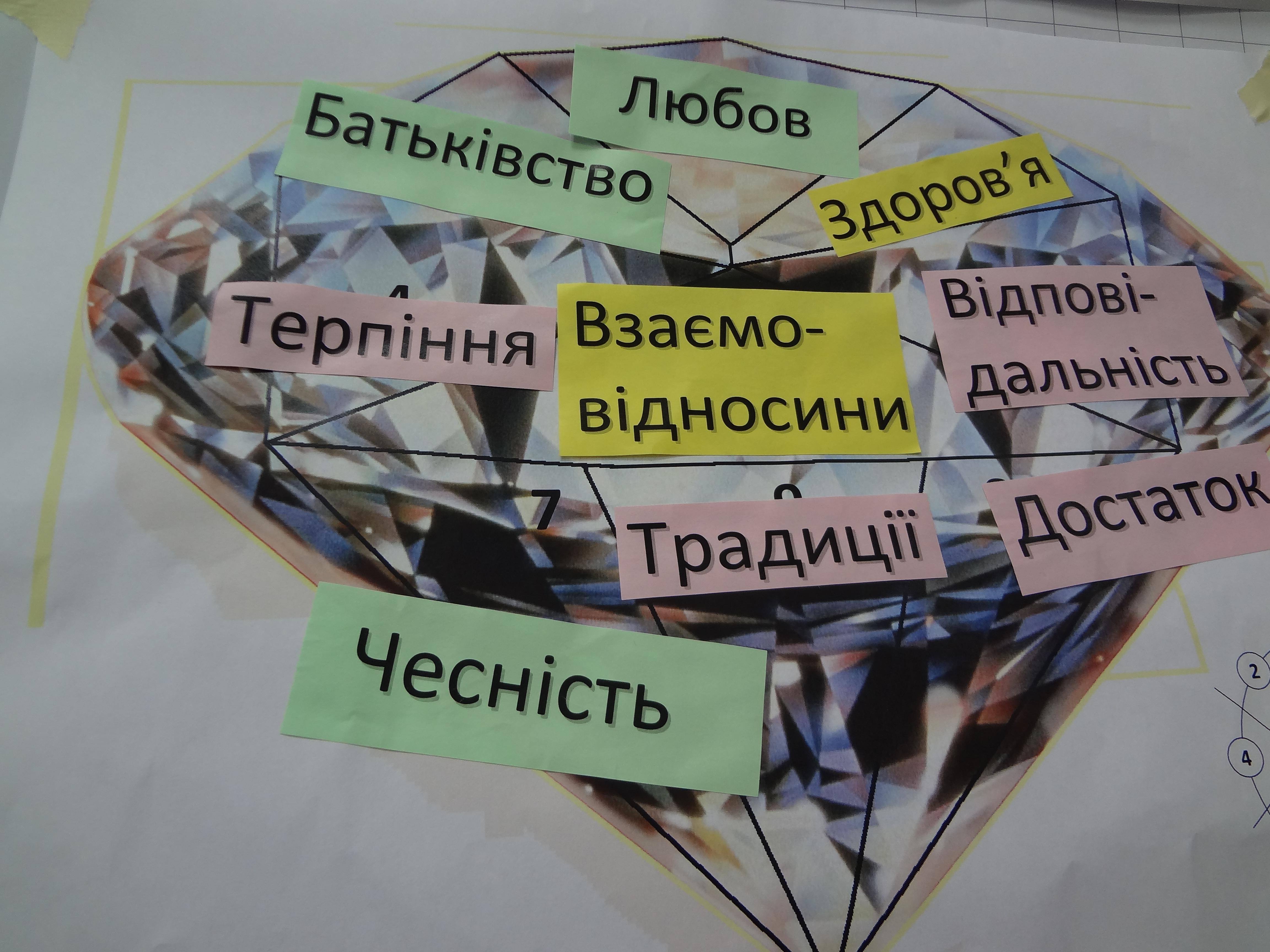 На сьогодні кандидати пройшли три тренінгових заняття. Перше заняття було присвячене загальному знайомству з учасниками та структурою програми навчання. Кожна сім’я з’ясувала свої спільні сімейні цінності, оцінила власну сімейну систему, її плюси-мінуси та створила на її основі яскраві діаманти. В якості домашнього завдання - оцінка сильних та слабких сторін кандидатів у ролі батька чи матері, досягнень у вихованні власних дітей, стосунків між ними, а також самоаналіз щодо поліпшення батьківських компетенцій.