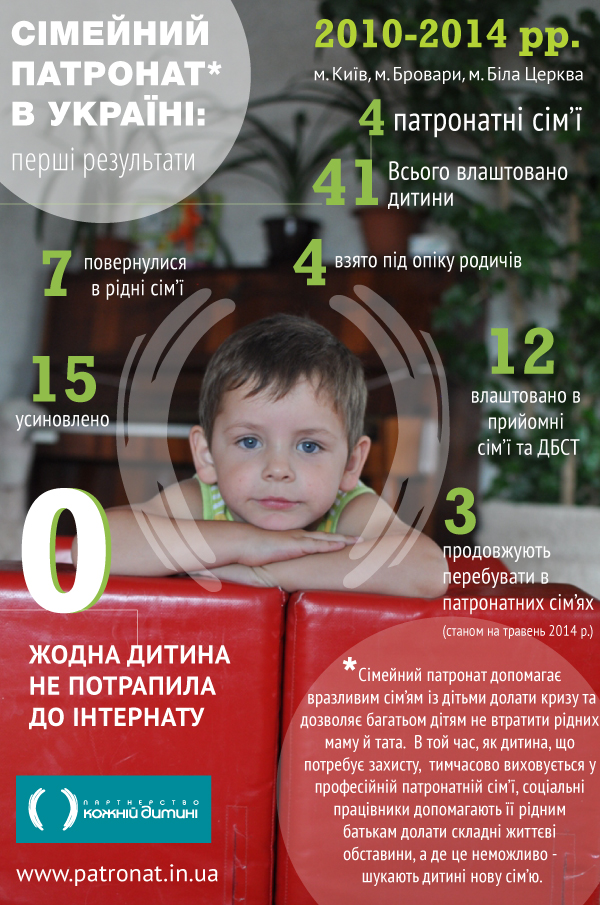 Запровадження сімейного патронату в Україні було розпочато Партнерством «Кожній дитині» у 2009 році в рамках соціального експерименту спільно зі Службою у справах дітей Київської міської та обласної держадміністрацій за підтримки Всесвітнього дитячого фонду (World Childhood Foundation) під патронатом королеви Швеції Сільвії. Суть цієї комплексної соціальної послуги полягає у тому, що поки дитина, яка тимчасово залишилися без батьківського піклування (наприклад, унаслідок вилучення у зв’язку із загрозою життю та здоров’ю дитини, через недогляд, жорстоке поводження, хронічний алкоголізм, наркотичну залежність батьків та інші випадки), тимчасово виховується в сім’ї патронатного вихователя, одночасно здійснюються інтенсивні заходи з відновлення здатності біологічних батьків опікуватись дитиною, а у разі неможливості - для дитини шукається нова сім’я. Завдяки специфіці роботи патронатні вихователі отримали назву «батьки напрокат», втім за увесь час роботи це дозволили попередити штучне осиротіння та потрапляння в інтернат близько 40 дітей із Києва та Київської області.